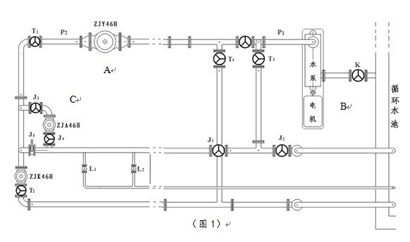 如圖1 所示:B為多級泵;A為被測減壓閥;C為安全泄壓閥。試驗系統開啟后,將P1高值調整為1.9MPa,然后在分別設定P2為各不同值,在各值中改變P1值,觀測在不同工況下的運行穩定性和噪聲。