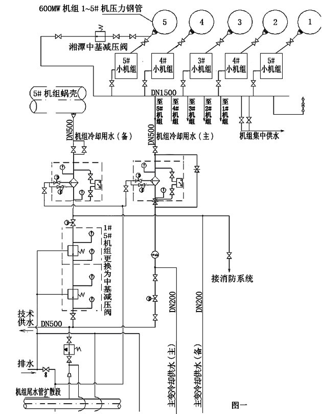 3.1機(jī)組技術(shù)供水系統(tǒng)(如下圖一所示)設(shè)計(jì)采用技術(shù)供水水源機(jī)組(小機(jī))集中供水和單機(jī)單元自流減壓供水的混合供水方式,其中一路是采用5臺(tái)水源機(jī)組發(fā)電減壓后的尾水集中匯流至匯流母管,從匯流母管上分別引出5路供水作為600MW機(jī)組的技術(shù)供水主用水源,另一路采用600MW機(jī)組鋼管取水通過(guò)自流減壓后作為600MW機(jī)組的技術(shù)供水備用水源。