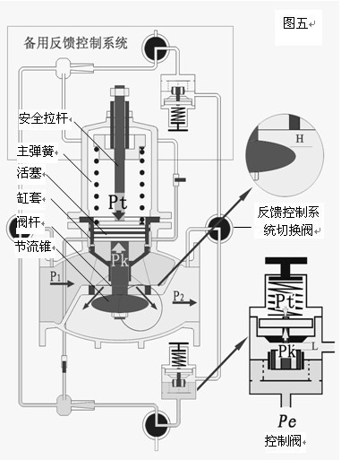 當(dāng)P1上升時(shí),減壓閥的P2+ΔP2首先表現(xiàn)為上升,其值通過(guò)反饋系統(tǒng)出口管傳到控制閥,使Pt′+ΔPt′,ΔPt′與Pk′的力達(dá)到新的平衡,控制閥h減小;相應(yīng)ΔPk′壓力增大,經(jīng)壓力導(dǎo)管,使主閥的Pk+ΔPk,Pt=Pk+ΔPk壓力達(dá)到新的平衡,主閥h減小、ΔP2值恢復(fù)為原P2值。當(dāng)進(jìn)口壓力P1下降時(shí),主閥與控制閥的工況則與上述的工況相反。